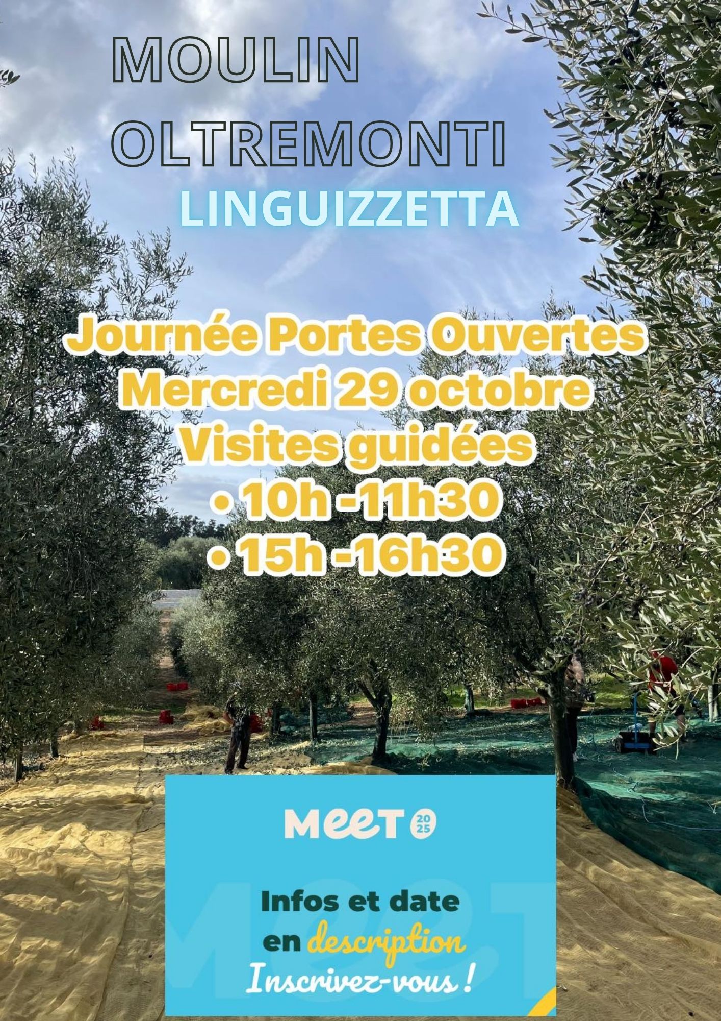LINGUIZZETTA 29/10/2025 29/10/2025 29/10/2025JOURNÉE PORTES OUVERTES AU MOULIN OLTREMONTI - LINGUIZZETTA - Visites guidées et dégustations à 10h et à 15hLe Domaine Oltremonti situé sur la commune de Linguizzetta vous ouvre ses portes pour une visite guidée suivie d'une dégustation..