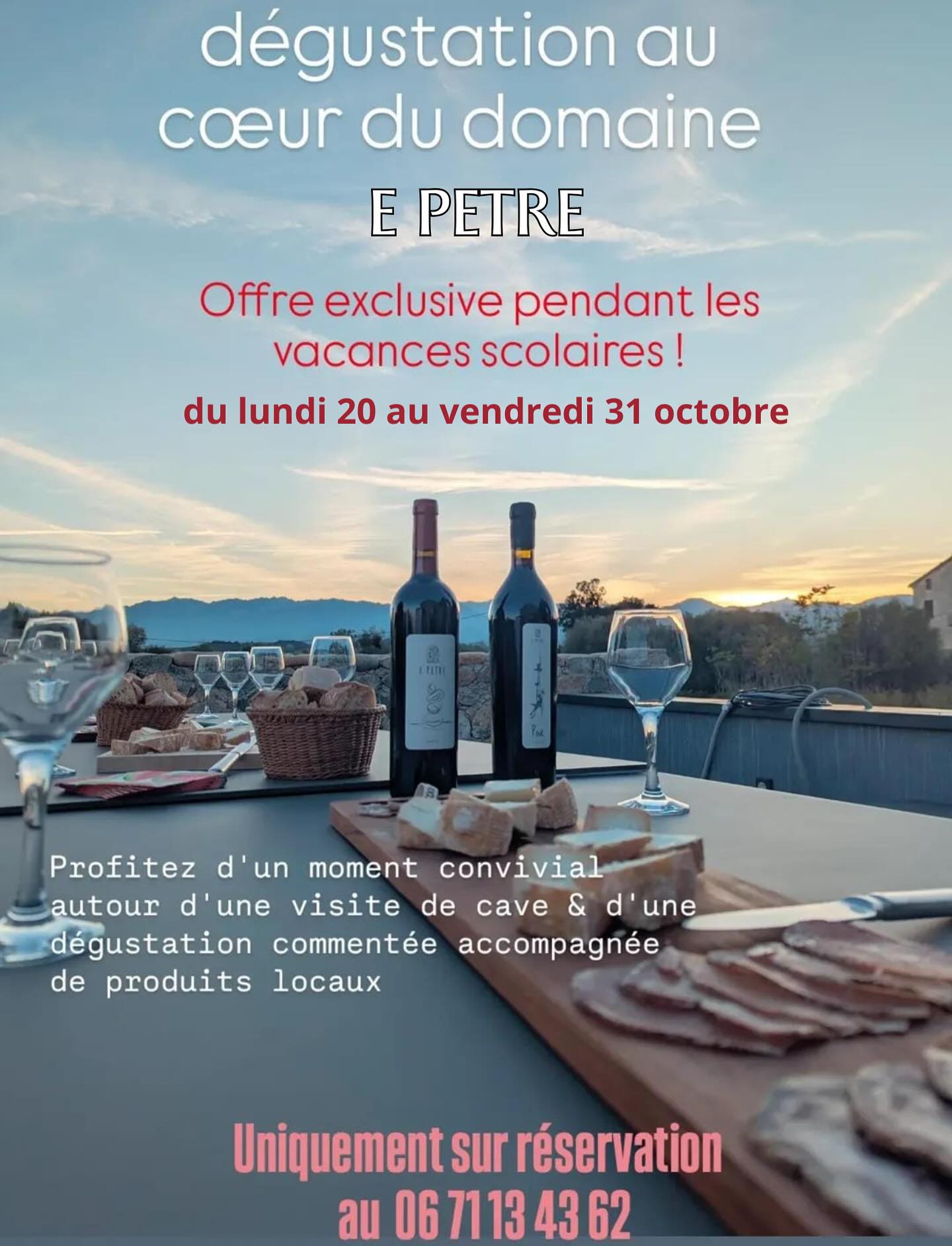 ALERIA - 20/10/2025 au 31/10/2025VISITE ET DÉGUSTATION AU DOMAINE E PETRE - ALERIA - (Du 20 au 31 octobre)Le Domaine E Petre situé sur la commune d'Aleria vous ouvre ses portes durant les vacances scolaires (du 20 au 31 octobre 2025) pour un moment..