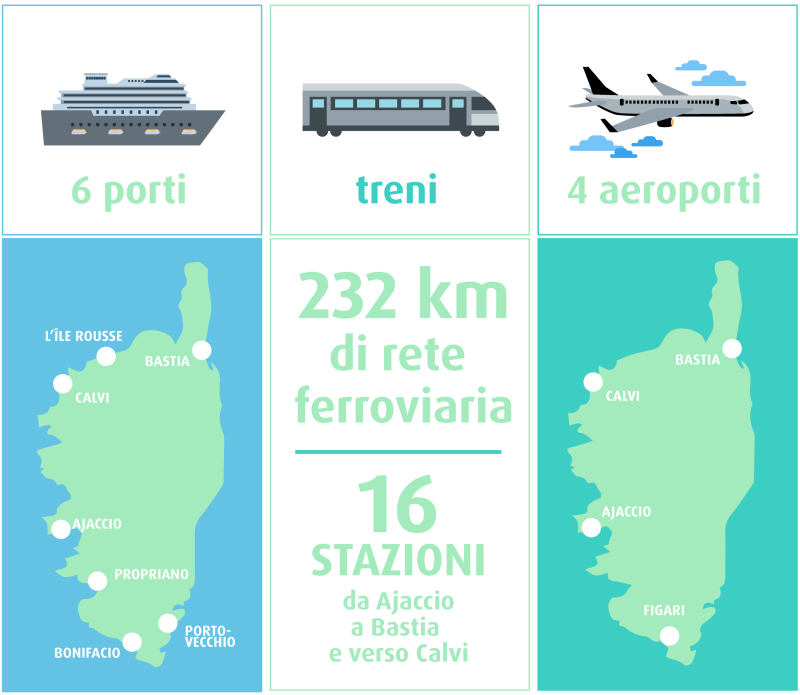 2) Trasporti marittimi: la Corsica è servita da 6 porti che consentono il trasporto di passeggeri e merci con collegamenti regolari da Marsiglia, Tolone e Nizza e altri porti italiani come Savona, Genova, Livorno e Piombino ; Golfo Aranci, Porto Torres dalla Sardegna.