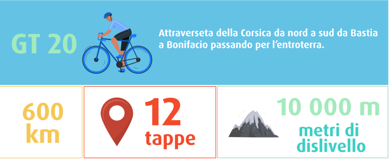 Lanciatevi sulla GT20, la Grande Traversata della Corsica, un'avventura cicloturistica di 600 chilometri e 10.000 metri di dislivello cumulativo. Il percorso, suddiviso in dodici tappe, permette di esplorare i paesaggi più mitici dell'Isola della Bellezza.