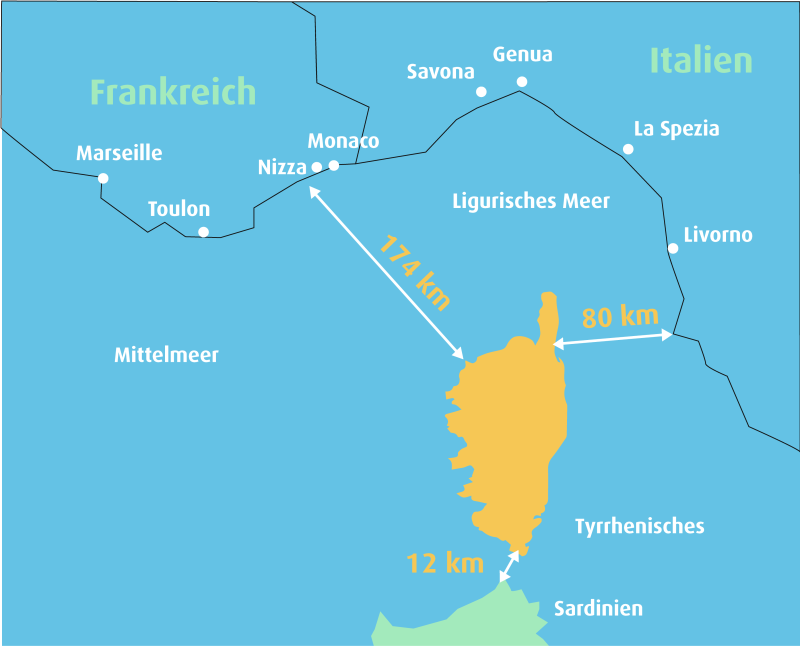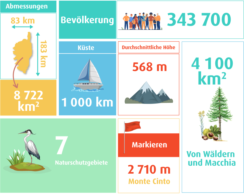 Korsika liegt im Herzen des Mittelmeers, nur 170 km von der französischen Festlandküste und 80 km von Italien entfernt. Ihre über 2000 Meter hohen Gipfel machen Korsika zur gebirgigsten Insel im Mittelmeer. Mit fast 1000 Kilometern Küste ist Korsika zudem die französische Region mit der längsten Küstenlinie.